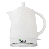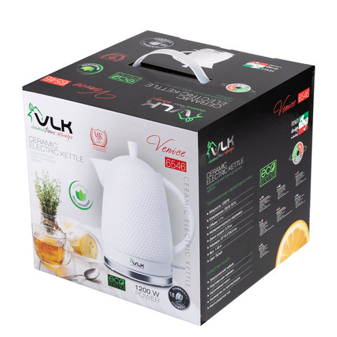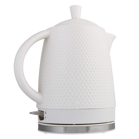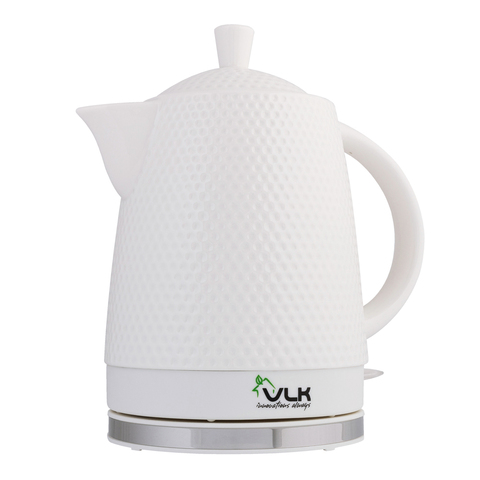 Материал - эко-керамика. Поэтому вода не имеет привкуса, в отличие от пластиковых чайников. Ещё одно достоинство такого чайника - он долго держит тепло и не остывает, что позволяет экономить электроэнергию. Также керамический чайник закипает намного тише, чем пластиковые и металлические.